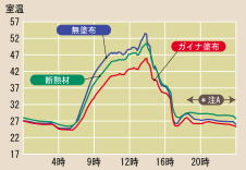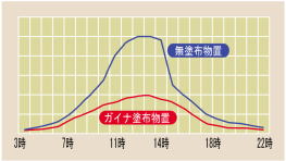 無塗布物置とガイナ(赤線)塗布物置の温度差は約7℃という測定結果を得ました。