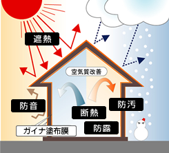 ▲ ガイナを住宅の屋根・外壁、内装に塗ると太陽光線や熱、音や汚れなどを跳ね返し